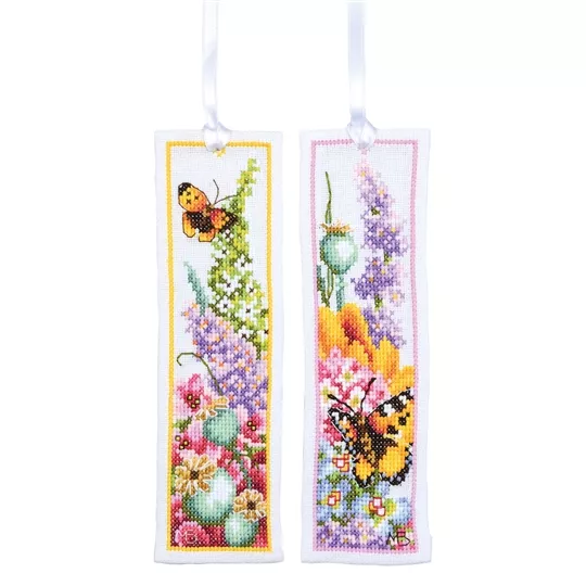 This counted cross stitch set of two bookmark designs from Lanarte contains Zweigart 27 count white evenweave fabric, DMC stranded cottons, needle, ribbon, enlarged chart and stitch instructions. Uses whole cross stitch and backstitch.
