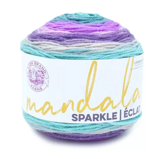 Mandala Sparkle from Lion Brand Yarns is a light DK yarn with multiple colours in a single cake, plus added colour co-ordinated metallic thread. Perfect for a myriad of magical projects from shawls, hats or baby blankets. 98% Acrylic 2% Polyester - Machine wash and dry - Crochet Hook size 5.00mm - Knitting Needles 3.75mm (US 7) - Tension 22 stitches on 30 rows to 10cm (4 inches) - Colour Aquila - a mix of light aqua, pale lavender, light wisteria, lavender, light mauve. bright mauve, dusty violet, bright cerulean all wrapped with a strand of metallic silver thread.