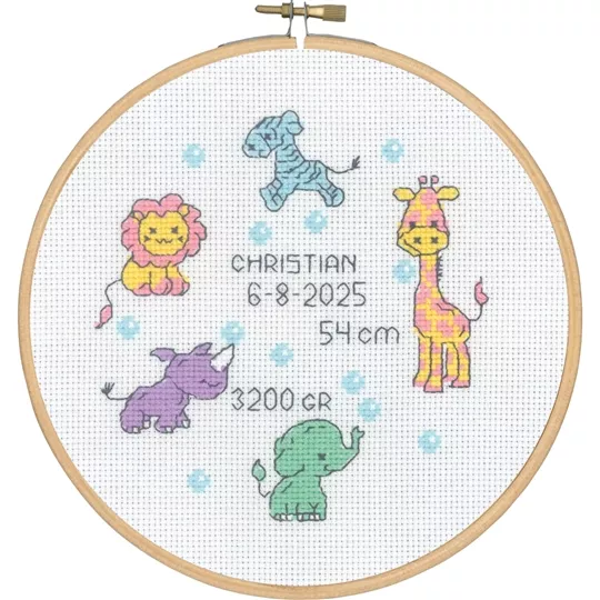 This counted cross stitch birth sampler from Permin of Copenhagen contains 14 count white aida fabric, DMC stranded cottons, wooden embroidery hoop, needle, chart with alphabet and instructions.