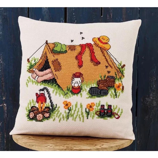 This counted cross stitch cushion front design from Permin of Copenhagen contains 8 count white aida fabric - including enough to back, DMC pearl threads, DMC stranded cottons, needle, charted design and instructions.
