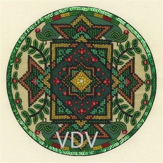 This bead embroidery design from VDV of Kyiv contains satin fabric with printed background and pattern, 59.5 grams of seed beads, beading needle and thread, paper chart and instructions. The beads are sewn with a single thread a row at a time, simply follow the printed pattern to select your next bead stitch by stitch.