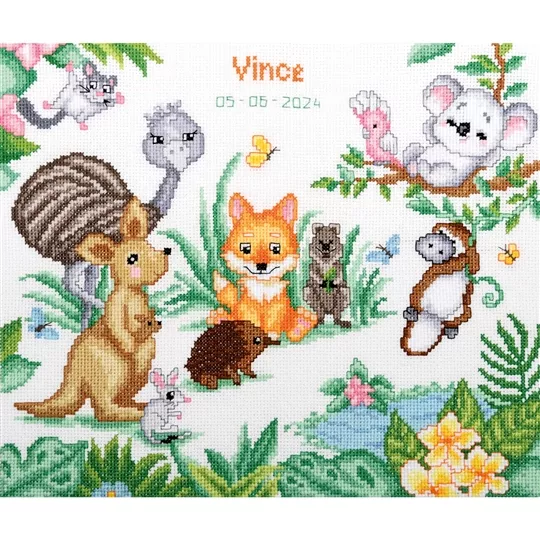 This counted cross stitch birth sampler design from Vervaco contains 14 count white aida fabric, DMC stranded cottons, needle, enlarged chart including alphabet to personalise and instructions. Uses cross stitch and back stitch.