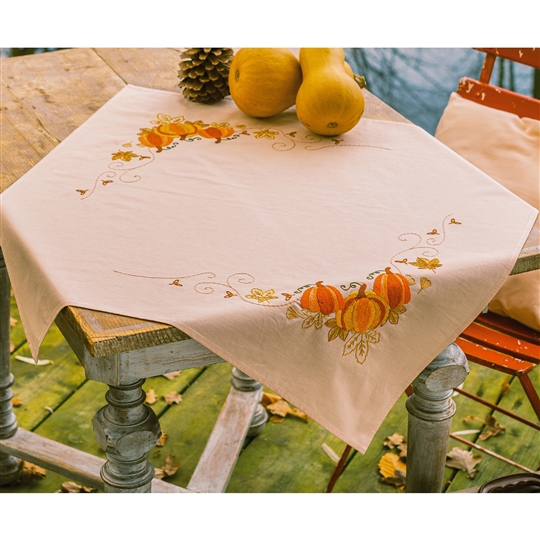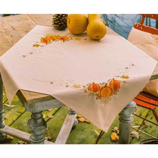 This embroidery table centre design from Vervaco contains salmon pink cotton tablecloth with hemmed inwoven border and printed design, DMC stranded cottons, needle, stitch chart and instructions. Uses satin stitch, long stitch, running stitch, stem stitch and long and short stitch.