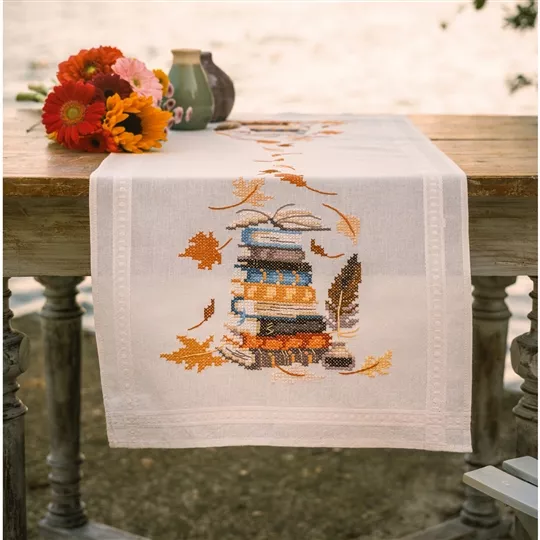 This stamped cross stitch table runner from Vervaco contains ecru cotton tablerunner with inwoven border and printed design, DMC stranded cottons, needle, stitch chart and instructions. Uses cross stitch and stem stitch.