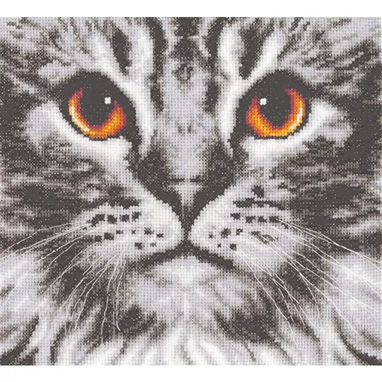 This counted cross stitch design from Vervaco, features a grey tabby cat with flame orange eyes in a close-up portrait style.