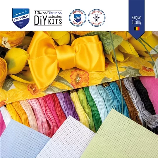 Take part in the latest Secret Stitch Along by Vervaco, purchase this pack containing the fabric and threads you will need, but the picture and instructions are not included. Register on the Secret Stitch Along facebook page, or the Vervaco website: https://www.vervaco.be/secret-stitch-along/ Registrations are open now, and from the 9th of March participants will receive a pattern every Monday, Wednesday and Friday for 4 weeks via email and on the facebook page. You will receive 12 different patterns making 12 mini masterpieces for spring measureing 7.5 x 9.5cm each which can be used for cards, ornaments and so much more. The kit contains Zweigart 18 count aida fabric in white, pale green and light blue, DMC stranded cottons and a needle.