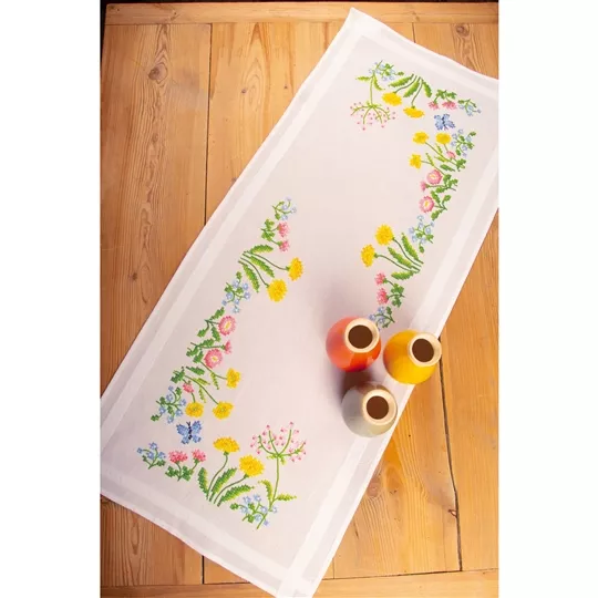 This stamped cross stitch tablerunner from Vervaco contains a white 100% cotton table runner with inwoven hem and printed design, DMC stranded cottons, needle, stitch chart and instructions. Uses cross stitch long stitch and stem stitch.