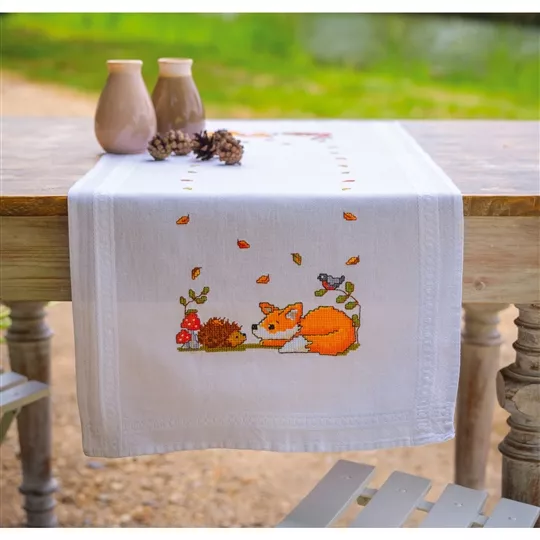 This stamped cross stitch tablerunner from Vervaco contains a white cotton table runner with inwoven hem and printed design, DMC stranded cottons, needle, stitch chart and instructions. Uses cross stitch, back stitch and Fench knots.