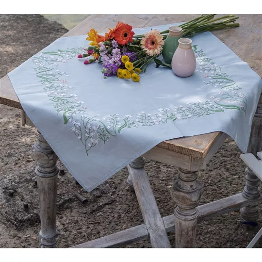 This embroidery table cloth design from Vervaco contains light blue 100% cotton tablecloth with hemmed inwoven border and printed design, DMC stranded cottons, needle, stitch chart and instructions. Uses satin stitch, long stitch, loop stitch, French knot, stem stitch and short stitch.