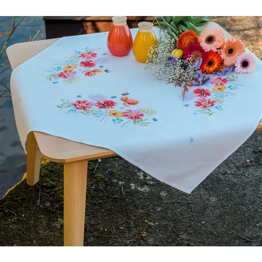 This stamped cross stitch table cloth from Vervaco contains white 100% cotton tablecloth with inwoven hem and printed design, DMC stranded cottons, needle, stitch chart and instructions. Uses cross stitch, stem stitch and back stitch.