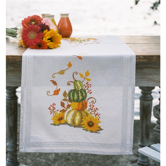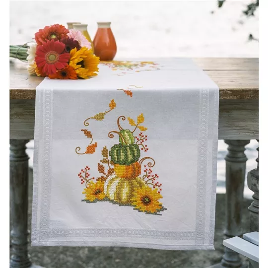 This stamped cross stitch tablerunner from Vervaco contains a light grey cotton table runner with inwoven hem and printed design, DMC stranded cottons, needle, stitch chart and instructions. Uses cross stitch, back stitch and stem stitch.