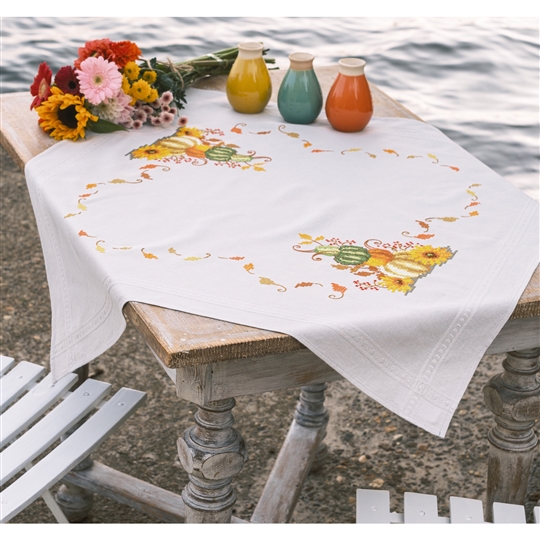 This stamped cross stitch tablecloth from Vervaco contains a light grey cotton tablecloth with inwoven hem and printed design, DMC stranded cottons, needle, stitch chart and instructions. Uses cross stitch, back stitch and stem stitch.