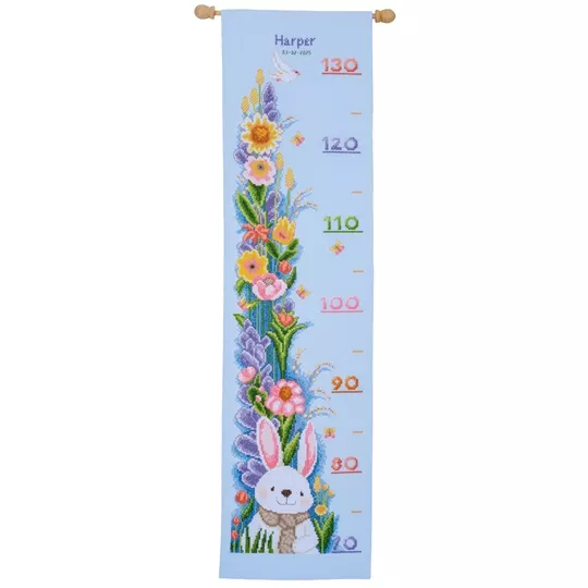 This counted cross stitch height chart design from Vervaco contains 14 count light blue aida fabric, DMC stranded cottons, needle, enlarged chart including alphabet and instructions. Uses cross stitch and back stitch.