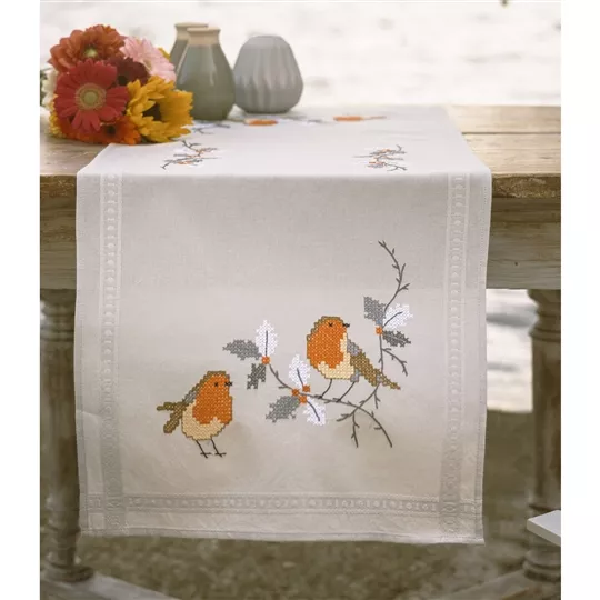 This stamped cross stitch tablerunner from Vervaco contains a light grey cotton table runner. with inwoven border and printed design, DMC stranded cottons, needle, stitch chart and instructions. Uses cross stitch, stem stitch and back stitch.
