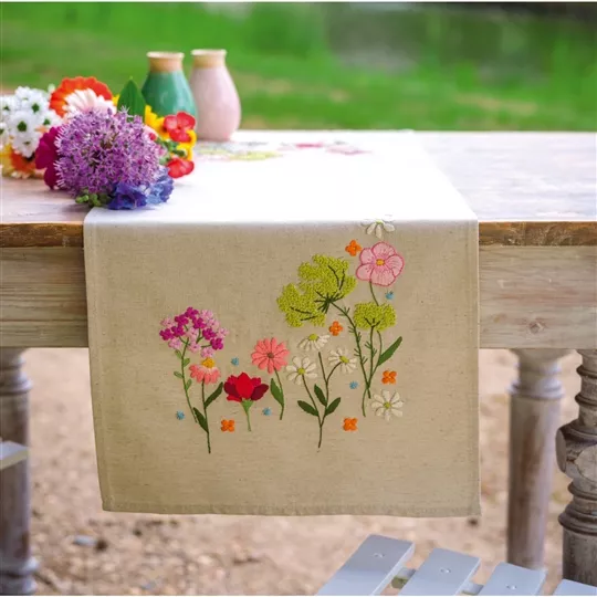 This embroidery table runner design from Vervaco contains natural 50% cotton, 50% linen tablerunner with hemmed inwoven border and printed design, DMC stranded cottons, gold and silver metallic threads, needle, stitch chart and instructions. Uses satin stitch, long stitch, loop stitch, French knot, stem stitch and short stitch.