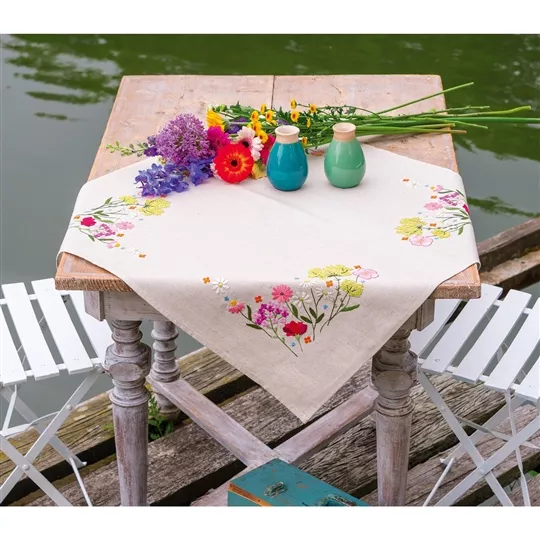 This embroidery table cloth design from Vervaco contains natural 50% cotton, 50% linen tablecloth with hemmed inwoven border and printed design, DMC stranded cottons, gold and silver metallic threads, needle, stitch chart and instructions. Uses satin stitch, long stitch, loop stitch, French knot, stem stitch and short stitch.