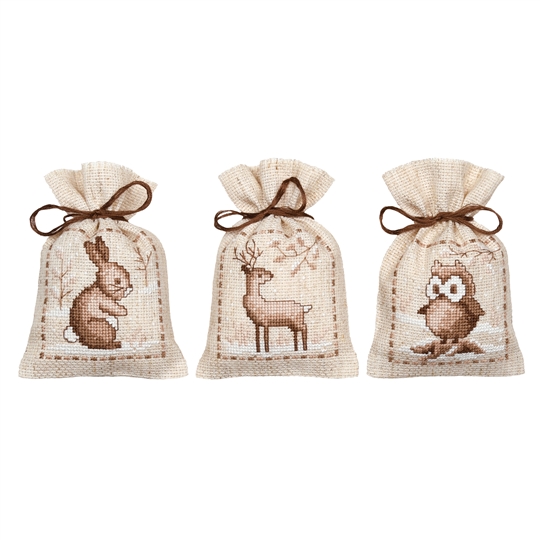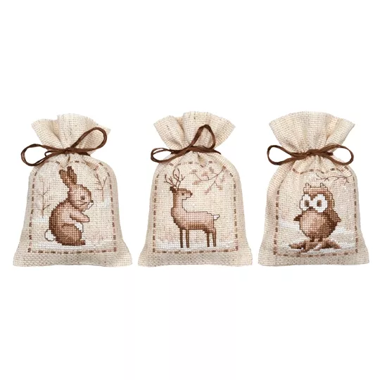 This counted cross stitch set of three gift or scent bags from Vervaco contains 18 count rustic pre-finished aida bags, DMC stranded cottons, ribbon, needle, enlarged chart and instructions. Uses cross stitch and long stitch.